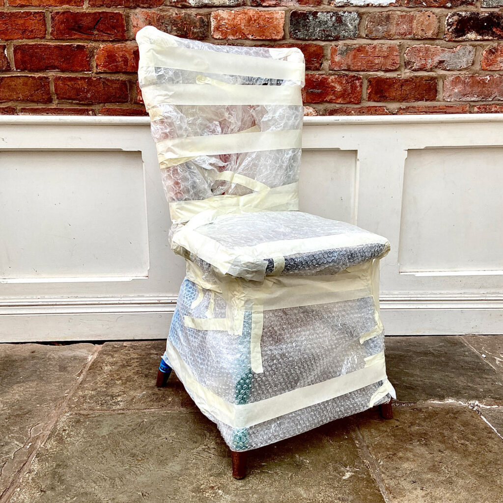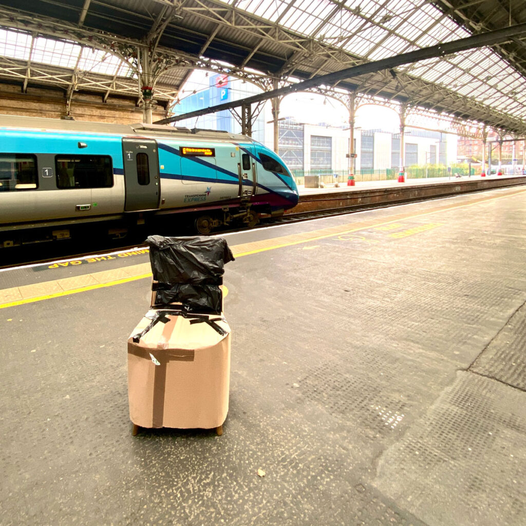 I felt highly self-conscious as I carried it through Preston train station. Worrying that such an odd sight would attract ridicule. That surely someone would stop me and then I’d be stuck and have failed in both travelling and delivering. Notice the additional layer of cardboard protection. Chair protected by bubble wrap protected by cardboard protected by me.