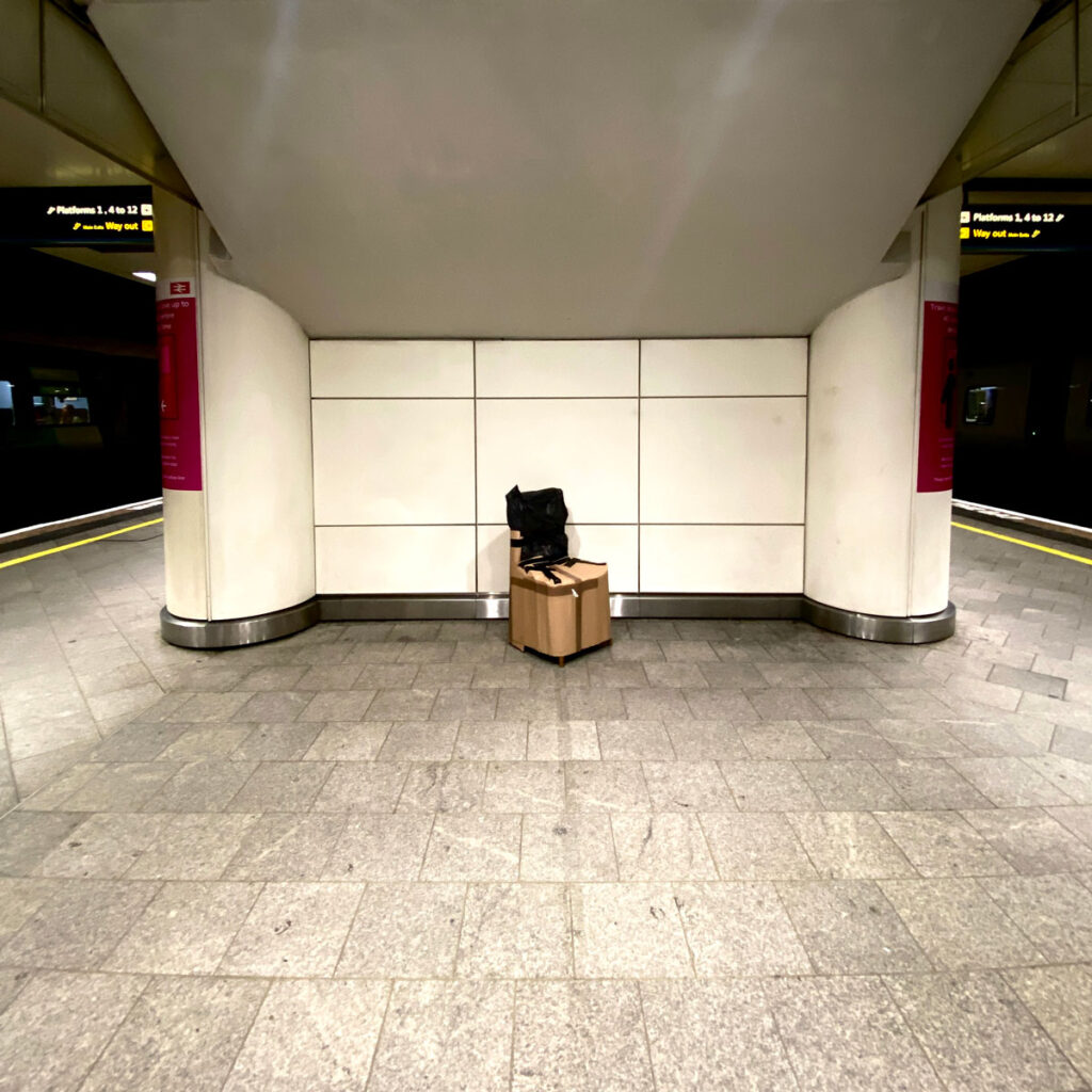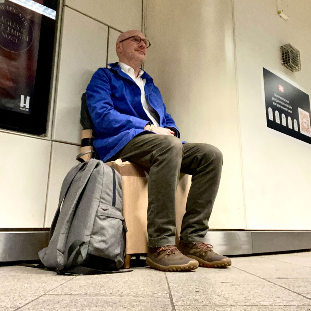 Arriving on our departure platform, with its conspicuous lack of seating for such a major thoroughfare, it dawned on me, like the sun rising above the horizon, majestic and revelatory, that I could sit on the chair. Wrapped or not it was still a chair. This was world changing. Like realising that there are no rules. That no one is in charge. That no one actually knows what is going on. That anything is possible. That we can choose how we live. That love ignores distance, death and gravity.